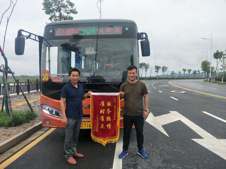 2018年5月22日,常德市柳葉湖旅游度假區(qū)白鶴鎮(zhèn)沾天湖社區(qū)主任顧佰平手捧著“準(zhǔn)時(shí)準(zhǔn)點(diǎn),熱情服務(wù)”的錦旗來(lái)到常德公交30路線終點(diǎn)站——沾天湖社區(qū)站臺(tái),親手將錦旗贈(zèng)予30路線路隊(duì)長(zhǎng)高曦,并感謝該線為保障沾天湖社區(qū)老百姓準(zhǔn)時(shí)準(zhǔn)點(diǎn)乘車(chē)出行所作的努力。
